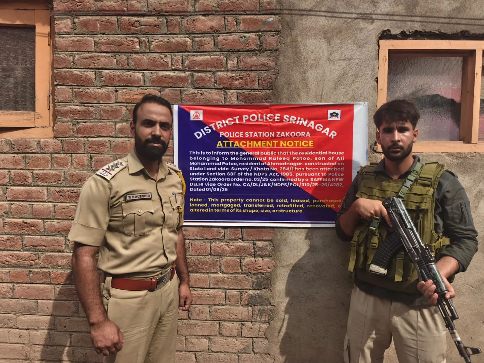 Acting under Sections 68-E and 68-F of the NDPS Act, Srinagar Police formally seized and attached the immovable property as per the due legal process, it said and added, the property cannot be sold, transferred, or otherwise dealt with without prior approval from the competent authority.
