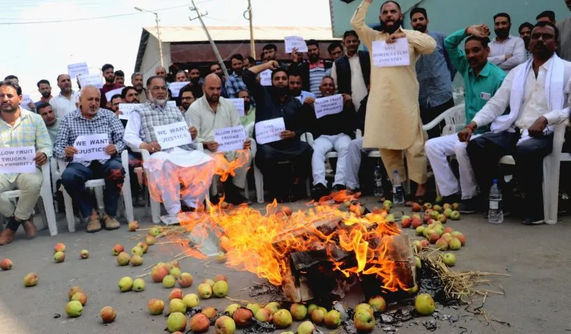 View More Handwara fruit growers stage protest580 fruit-laden trucks ply on Mughal Road