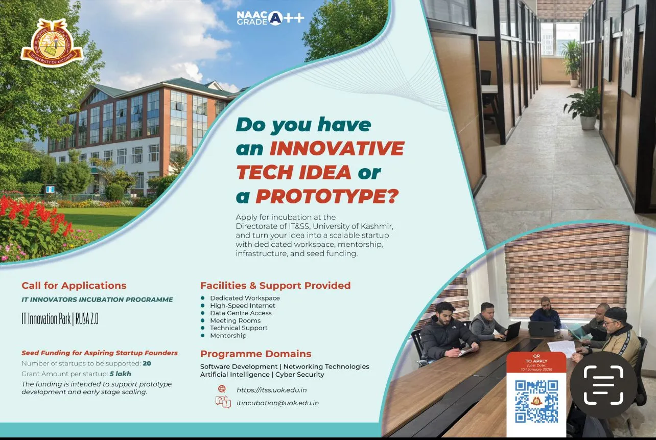 “Eligible innovators and aspiring entrepreneurs are encouraged to apply and leverage this opportunity to transform their ideas into impactful and sustainable technology solutions through the state-of-the-art facilities at the IT Innovation Park, University of Kashmir,” it reads.